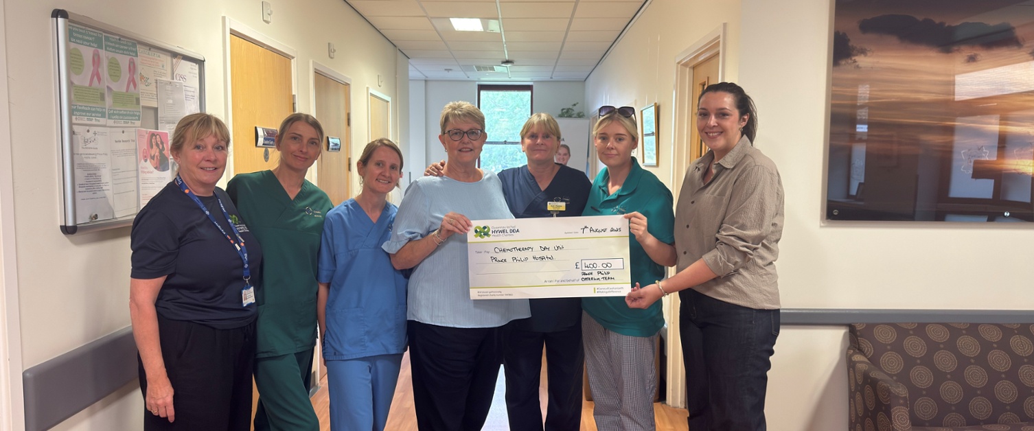 Kath Watkins, Senior Sister, said: “On behalf of the staff and patients at the Chemotherapy Day Unit at Prince Philip Hospital, I would like to thank the catering team for their fundraising efforts resulting a very generous donation of £400.